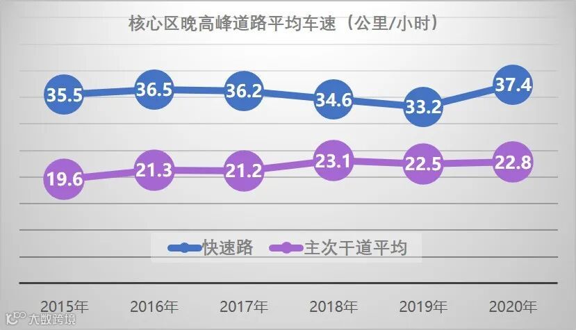 2020年全市小汽车保有量248万辆,小汽车出行占机动化比例从36%上升到45.5%,但车辆载客率增加21%,出行距离下降13%,核心区晚高峰干道平均车速仍保持22.8公里/小时,道路交通运作保持平稳。