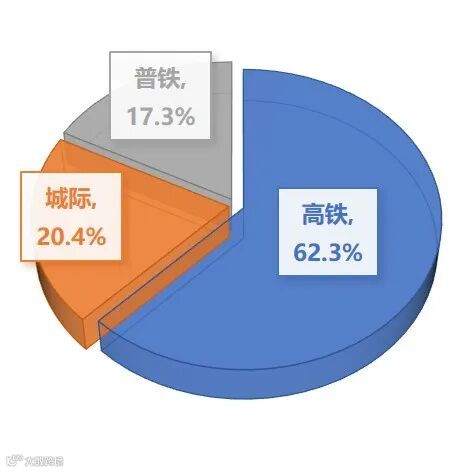 2020年广州铁路枢纽高铁、城际和普铁制式旅客发送量占比分别为62.3%、20.4%和17.3%。与2019年相比,高铁比例增加5个百分点,城际比例下降6个百分点,普铁比例基本不变,疫情对城际客流影响较大。