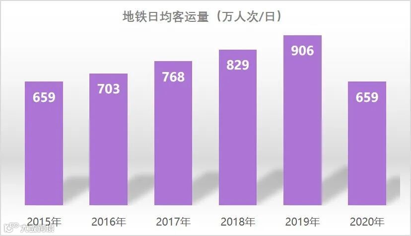 地铁通车里程增长1倍,实现“区区通地铁”。运营线路从2015年的9条、266公里增长至2020年的16条、531公里,站点从139座增加至238座,将轨道交通服务延伸至外围区,实现了外围区与中心城区的快速联系。2019年日均客运量906万人次,增幅37.5%,全网轨道客流强度1.90万人次/公里。2020年受疫情影响,日均客运量降至659万人次,客流强度降至1.24万人次/公里。