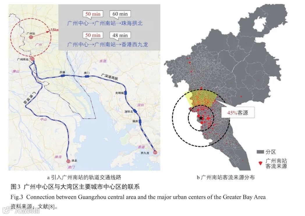 大湾区发展要聚成一个整体,各城市的核心功能区就要首先形成有机整体。目前,广州中心区与大湾区内其他城市中心区的快速直达性不足,高铁、城际铁路仅接入到城市外围的广州南站,广州南站45%的客流目的地为中心区,以城市轨道交通普线进行衔接,联系时间通常在50min以上,往往出现市内通行时间超过城际间出行时间的现象。因此,广州与深圳、香港、珠海、澳门等大湾区主要城市中心区联系出行时间至少在1.5h以上(见图3),不能满足大湾区1h出行圈需要。