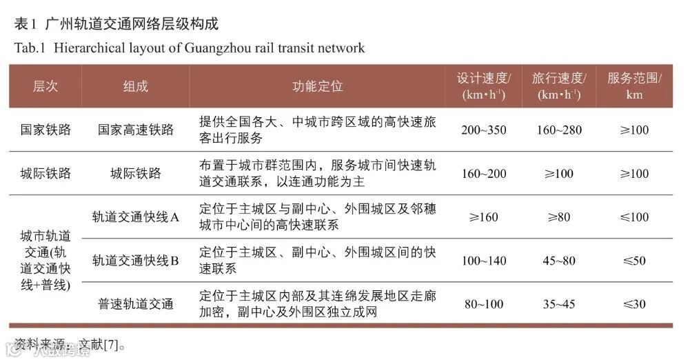 重点提出加快湾区铁路和轨道交通快线A的规划布局举措,完善轨道交通网络层级系统,形成多模式深度融合的轨道交通系统,满足不同层次轨道交通出行需要(见表1)。湾区铁路包括国家铁路和城际铁路,重点对其延伸引入广州城市中心区。轨道交通快线A定位于广州中心区(主城区)与副中心、外围城区及邻穗城市中心间的高快速联系,设计速度160 km/h以上。