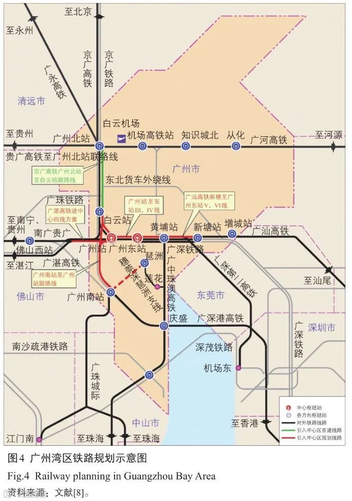 加强广州与粤港澳大湾区各城市合作共赢,促进大湾区枢纽的布局形态由“一群枢纽”向“一个枢纽群”融合发展,提高大型交通枢纽在更大层面服务能力。规划湾区铁路与国家铁路、城际铁路协调(见图4),主要包括广深港广州南站至广州站联络线、广州站至广州东站Ⅲ-Ⅳ线、广汕高铁新塘至广州东站Ⅴ-Ⅵ线,实现高铁、城际铁路进中心,促进广州中心区与湾区各主要城市中心区快速直达。