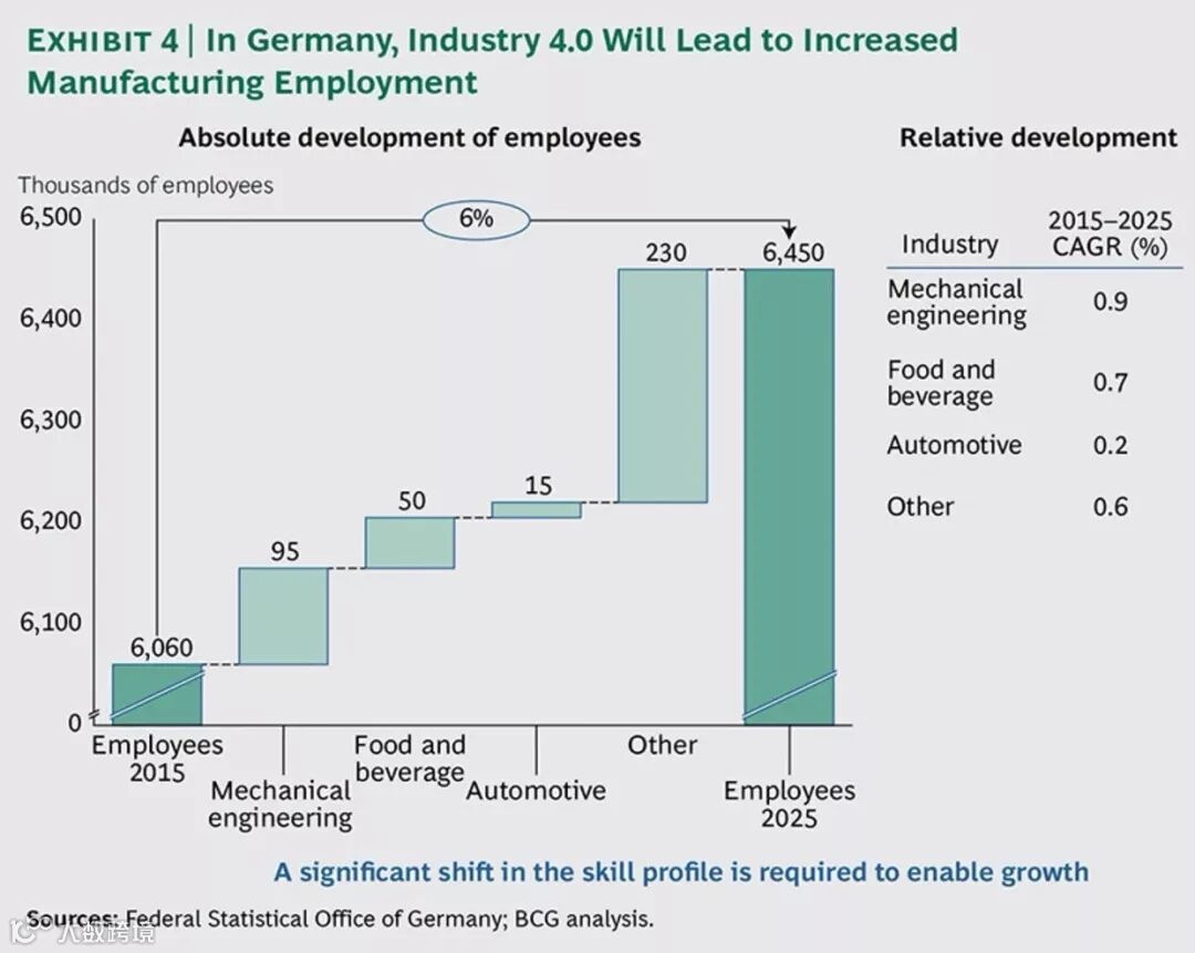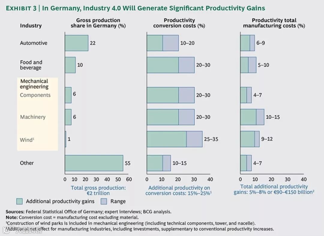 收入增长。工业4.0也将推动收入增长。制造商对增强型设备和新数据应用的需求,以及消费者对更多种类越来越多的定制产品的需求,将推动每年约300亿欧元的额外收入增长,约占德国GDP的1%。