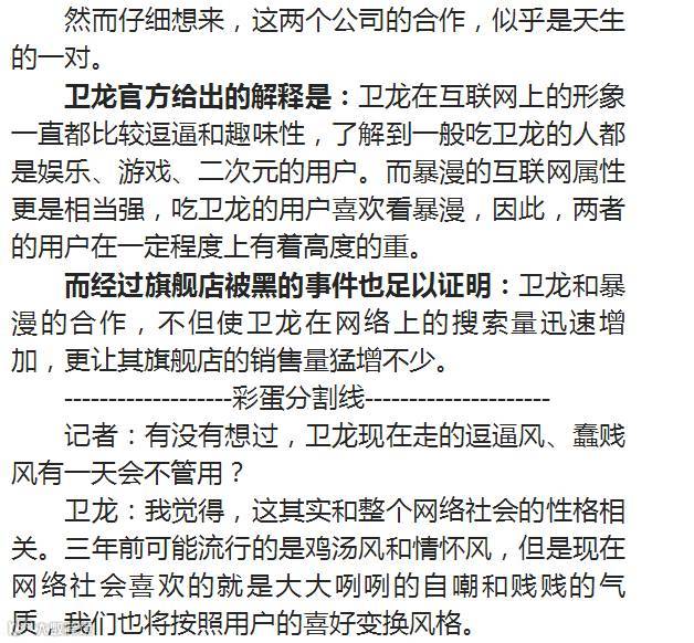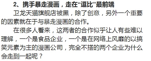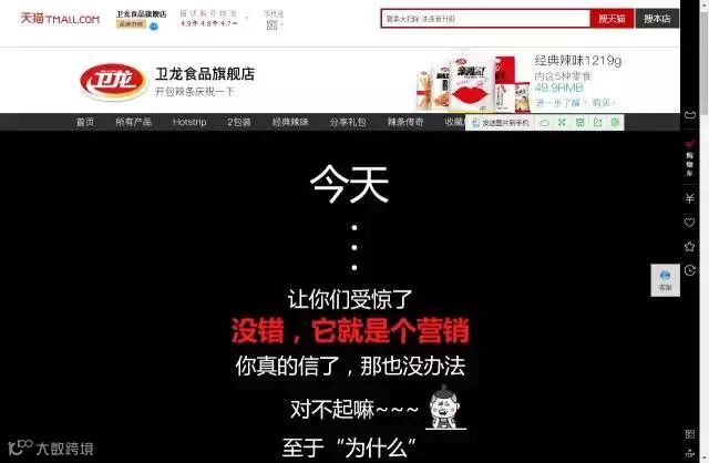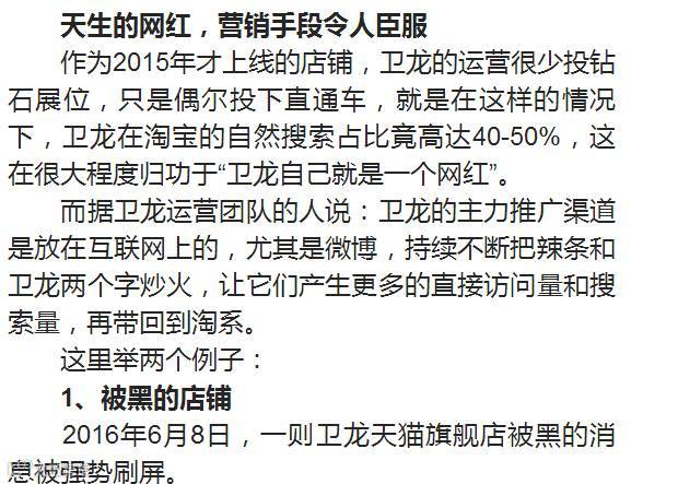 作为2015年才上线的店铺,卫龙的运营很少投钻石展位,只是偶尔投下直通车,就是在这样的情况下,卫龙在淘宝的自然搜索占比竟高达40-50%,这在很大程度归功于“卫龙自己就是一个网红”。