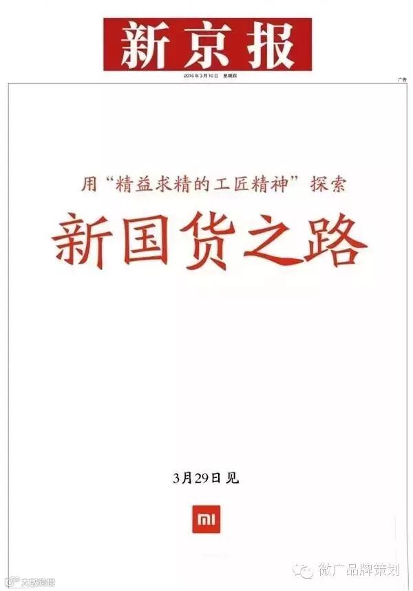 3月10日,小米包下了新京报的头版打广告,广告内容非常简单,只有“用精益求精的工匠精神探索新国货”之路几个字,下方还有“3月29日见”。