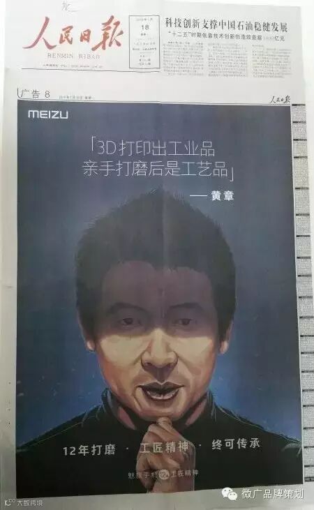 1月18日,《人民日报》魅族广告占了一个整版,广告主题是漫画形式的黄章个人照,上部是他的一句名言:“3D打印出工业品,亲手打磨后是工艺品。”