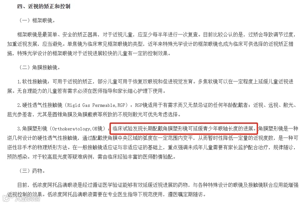 国家卫生健康委发布的《近视防治指南(2024年版)》在“近视的矫正和控制”一栏中的角膜塑形镜部分,明确表示“临床试验发现长期配戴角膜塑形镜可延缓青少年眼轴长度的进展”,这是普通框架眼镜做不到的。