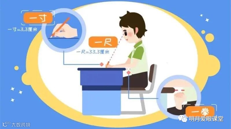 看书或写作业时,要牢记一尺一拳一寸(阅读距离33cm;身体距桌8cm;手距比肩3.33cm);上网课、看电视时也要注意坐姿,与屏幕保持30cm左右的最佳距离。