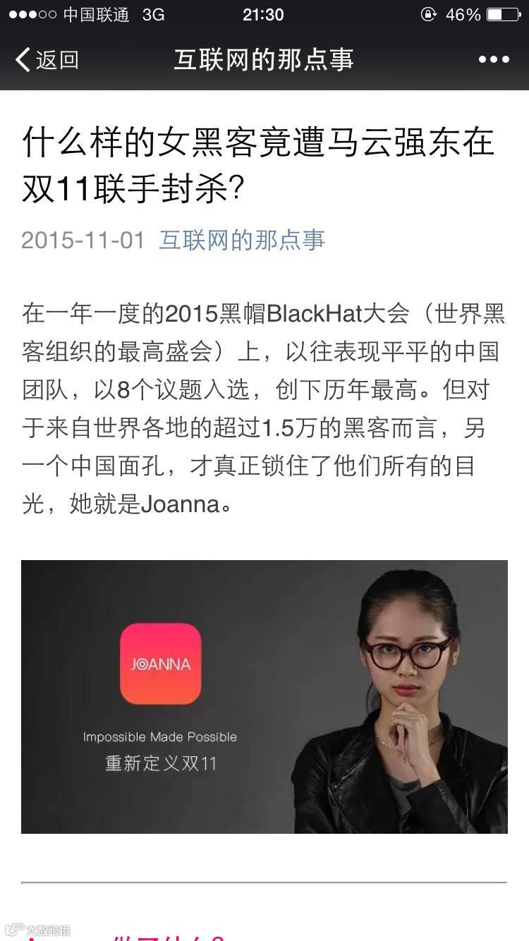 文中说她在2015黑帽BlackHat大会(世界黑客组织的最高盛会)上发表演讲...号称破解了阿里和京东的电商时间系统,开发了一款能比价能提前抢购双十一的APP,并被马云强东联手封杀。