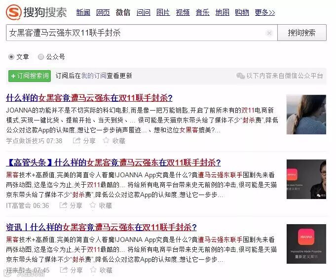 被封杀听上去很厉害,但是强东和Jack真是无辜躺枪,搜狗搜索的购物搜索频道已经上线多年,别说简单的比价功能了,搜索全网最低价、监控价格趋势等功能齐全,也并没有被强哥和Jack封杀啊,京东和阿里作为开放透明经得起市场考验的电商平台根本没必要做这种事啊....