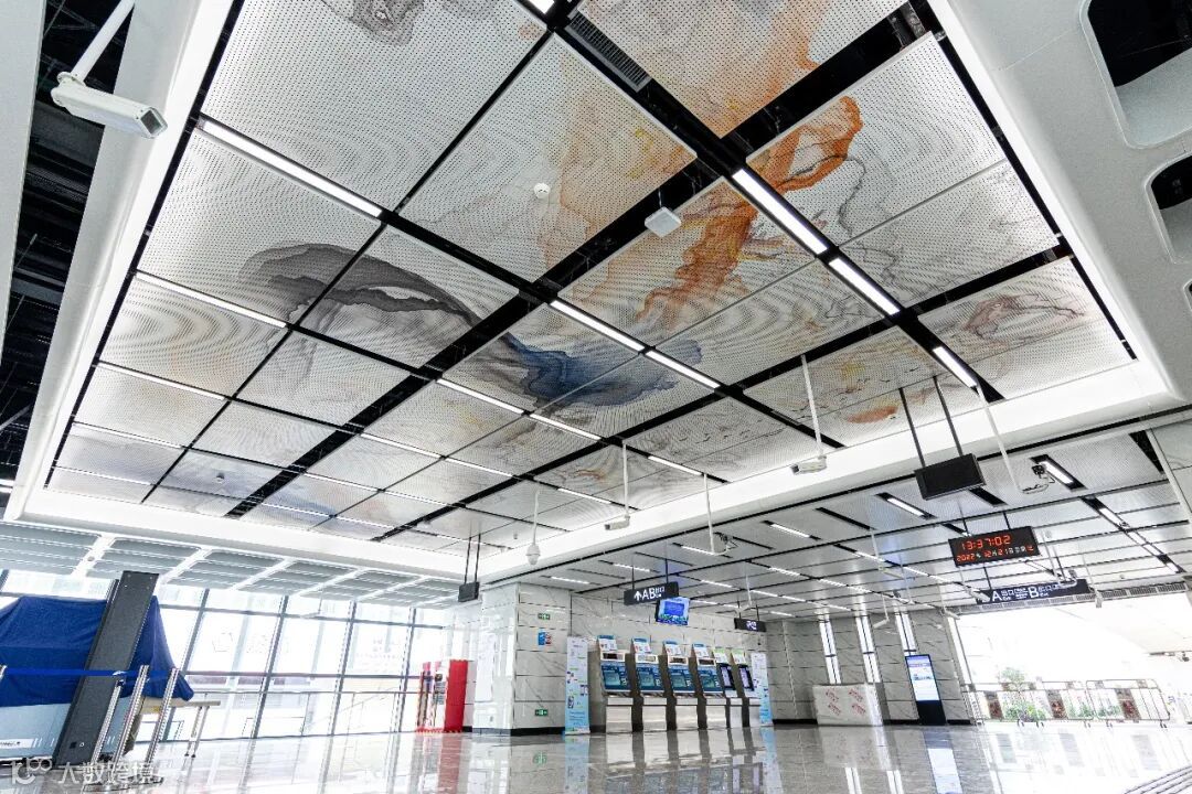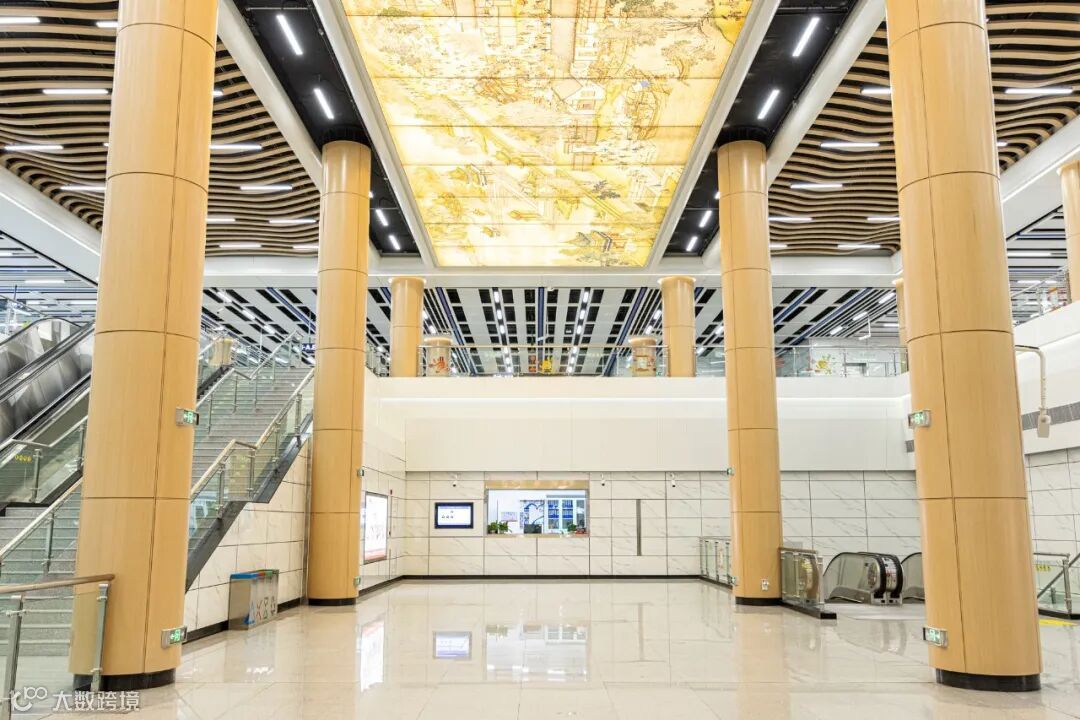 东平站提取城市绿洲荷花及水波纹元素,结合本站独有的大中庭空间,站厅中庭天花以大幅透光软膜“清明上河图”图案呈现,凸显建筑空间的恢宏大气,体现水乡文化特色。