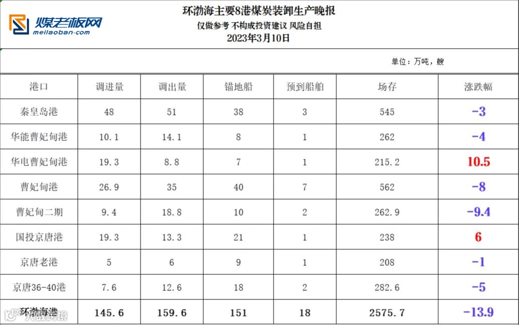环渤海主要港口煤炭装卸生产晚报