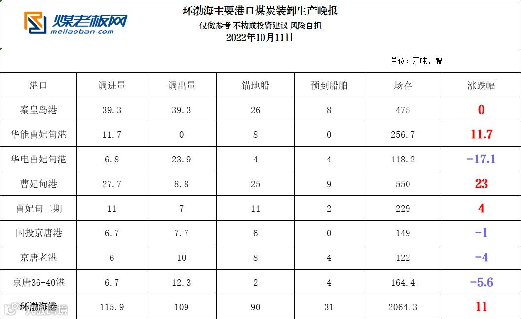 环渤海主要港口煤炭装卸生产晚报