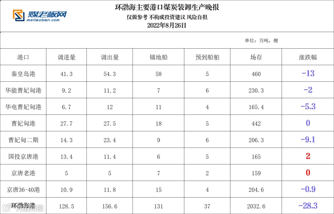 环渤海主要港口煤炭装卸生产晚报