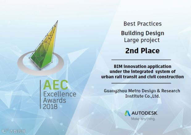 2018年11月中旬, Autodesk公司在美国的Autodesk University( AU大师汇)上,举行了AEC Excellence Awards 2018(2018年全球工程建设业卓越BIM大赛)的颁奖仪式。设计院组织申报的 BIM innovation application under the integrated system of urban rail transit and civil construction(城市轨道交通与民用建筑一体化系统下的BIM创新应用)民建项目和段场项目分别获得大型项目组建筑设计类别最佳实践奖第二名和基础设施设计类别最佳实践奖第三名。