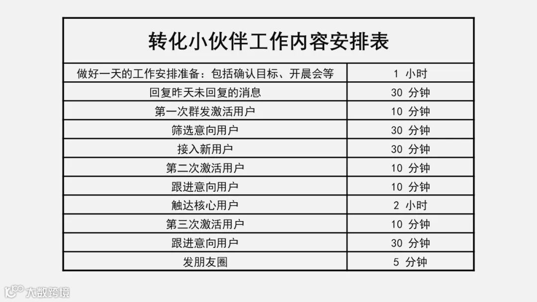以转化小伙伴工作为例,刚入行的转化小伙伴,每天的规划内容可能是“ 1 小时做准备+ 6 小时聊客户+ 1 小时做总结”。