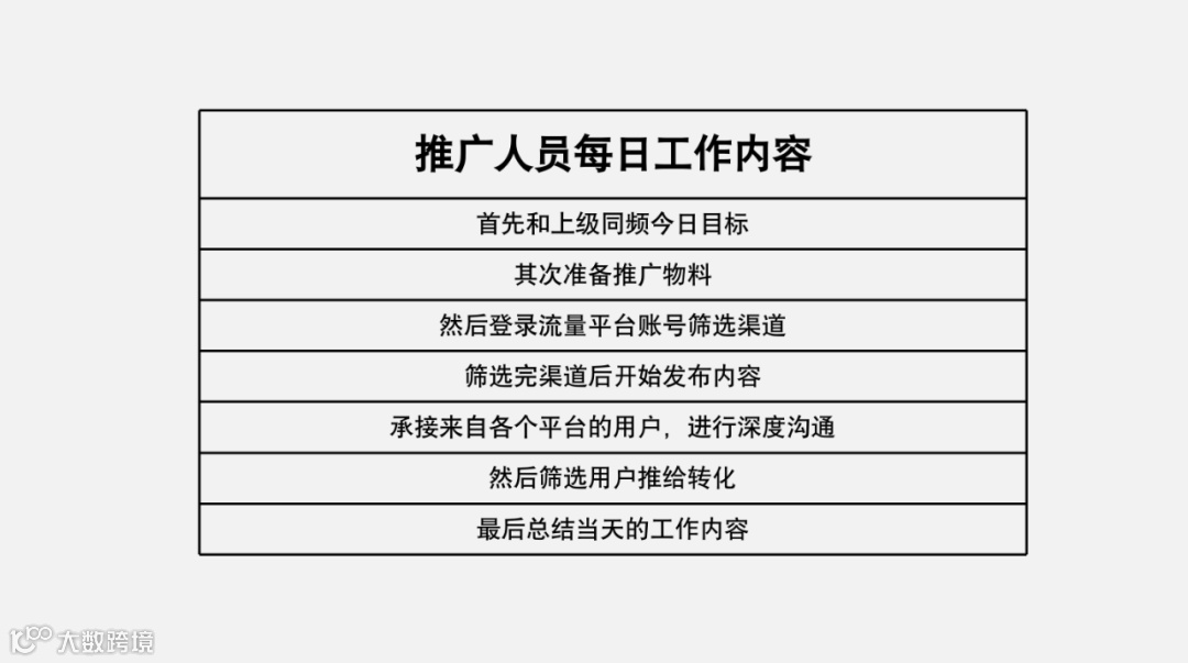 一名推广人员每日要做的工作内容大致可拆解为: