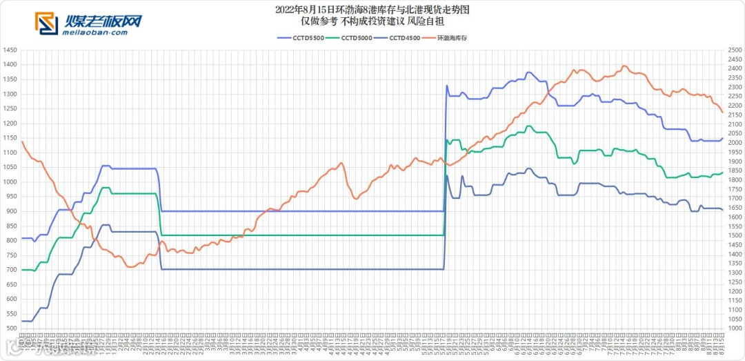 港口:港口报价小幅探涨,受降雨影响,近两日港口调入量减少明显。截止8月15日环渤海8港口调进量140.2万吨,调出量167.4万吨,库存↓27.5万吨。实际货源报价整体上涨,其中 5500卡:1140~1160;5000卡:1015~1050;4500卡:900~910。