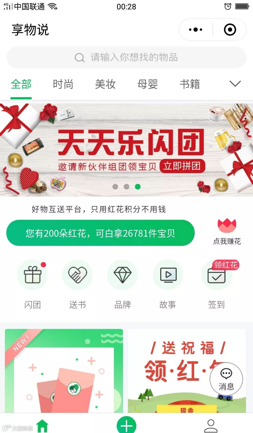 初次使用小程序,即可获得 200 朵小红花。小红花就是像是享物说的货币,用来交换你想要的物品。