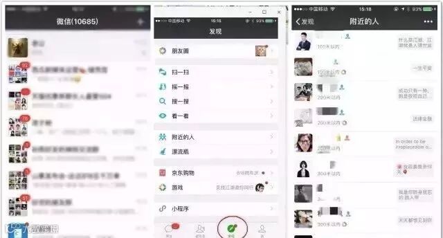 “附近的人”是微信最开始的功能。作为社交工具,微信的社交分为两个:“熟人社交”与“生人社交”。“熟人社交”展现在首页的对话框。而生人社交则需要两步:在“首页”点击“附近的人”,从而进入“生人社交”界面。