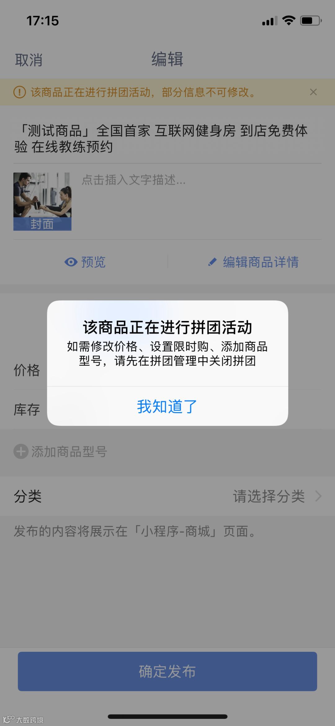 拼团与砍价相同,可以编辑,但正在进行的拼团的商品部分字段不能修改: