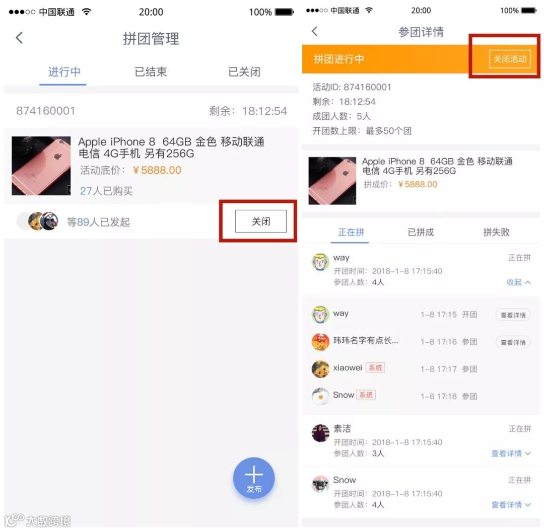 点击拼团管理和详情页中的「关闭拼团」按钮即可关闭拼团活动。