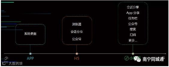我们发现,APP只能够在系统桌面上点开。H5比APP有更多的连接场景,比如浏览器和公众号,但在移动互联网没有网址的概念,记住一个网址很难。