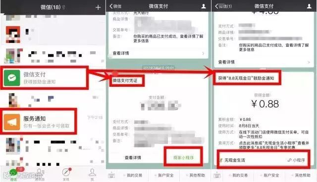 这一点,小海深有体会,在活动期间,在便利店购物,使用微信支付后,以往都只有一条“微信支付凭证”,上面会显示你本次消费的支付方式、商品详情、交易单号等。而现在,除了这些内容,支付凭证的右下角还有“商家小程序入口”,绿色的字体非常醒目。同时,还有一条8.8无现金日支付鼓励金的获得通知。