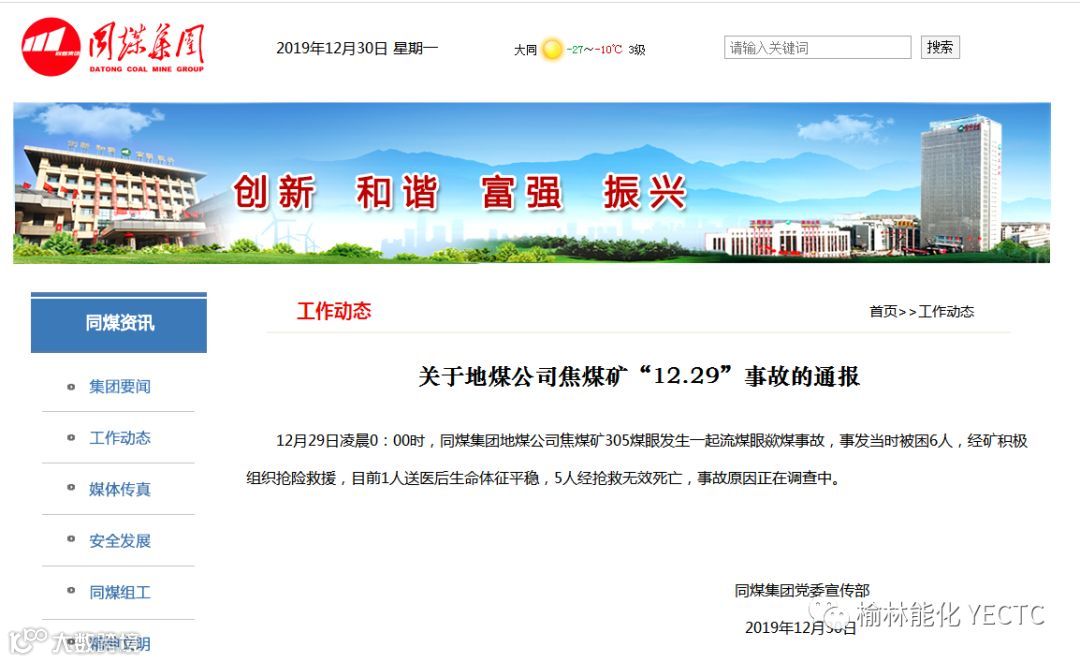同煤集团官网消息,12月29日凌晨0:00时,同煤集团地煤公司焦煤矿305煤眼发生一起流煤眼歘煤事故,事发当时被困6人,经矿积极组织抢险救援,目前1人送医后生命体征平稳,5人经抢救无效死亡,事故原因正在调查中。