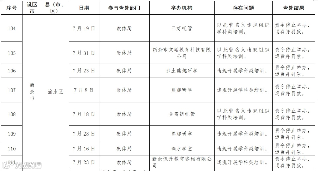 据了解,今年以来,我省持续加强校外培训治理,对各类违规校外培训保持“零容忍”态度,坚持露头就打,从严从快从重查处学科类隐形变异培训行为,巩固提升“双减”工作成效。1月至6月,全省各地共查处违法违规培训300余起,罚款50万余元。 现通报如下,一起来看↓↓↓