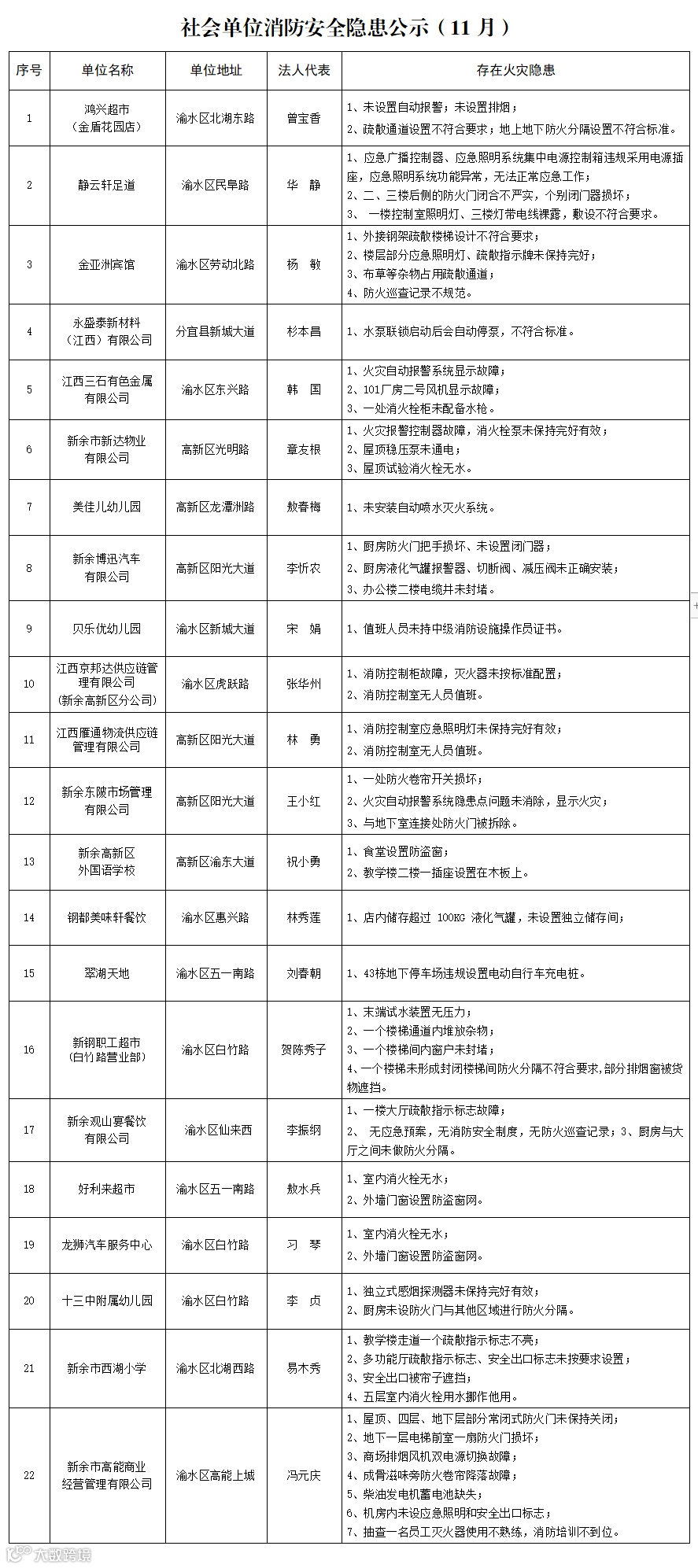 11月份社会单位消防安全隐患公示