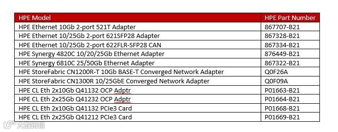 好消息是对于企业客户而言,有多款 HPE 出品的 Marvell® FastLinQ® 以太网适配器支持通用 RDMA,因此企业客户能够自由选择最适合他们的低延迟 RDMA 方案。 以下是目前同时支持 RoCE 和 iWARP RDMA 的 HPE 以太网适配器清单。