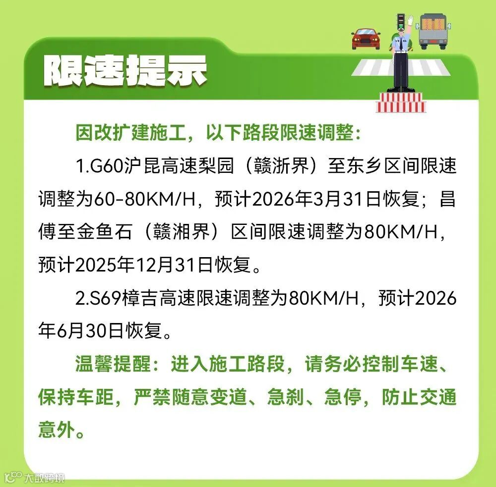 G60沪昆高速梨温段,经开区站入口全封闭,上饶东、广丰、玉山、上饶西站入口往南昌方向封闭;