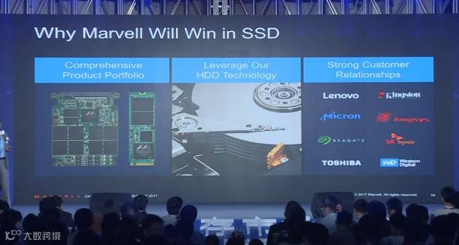 存储作为Marvell起家的业务,目前占到其公司内部50%的市场份额。由于Marvell是从HDD 硬盘时代做起,在HDD领域的很多技术积累同样将应用到SSD市场。据介绍,根据最近刚发布的季度财报,Marvell的SSD存储的增长幅度接近60%。