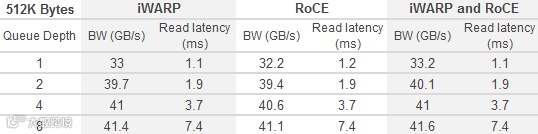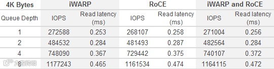 iWARP、RoCE或同时采用这两种技术时的IOPS速率和延时类似并保持一致。