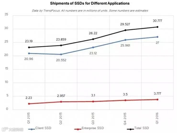图1:2016年第一季度SSD全球出货量同比大增30%以上。(数据来源:TrendFocus)