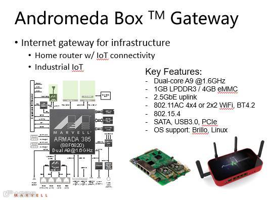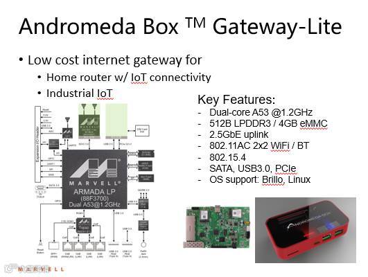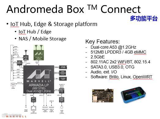 此系列的第二款平台Andromeda Box Connect将紧随其后,采用了Marvell的双核ARM Cortex A9应用处理器ARMADA® 385,并集成了SATA、Wi-Fi、蓝牙802.15.4以及连接云服务的2.5GbE上行链路,非常适合IoT网关解决方案。