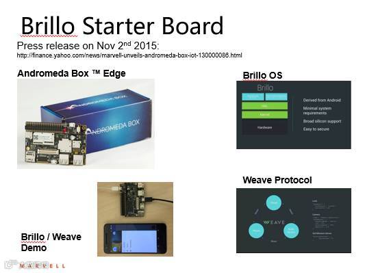 此外,Marvell 还发布了Brillo Starter Board方便初学者快速上手。它支持谷歌的Brillo OS和Weave通信协议。