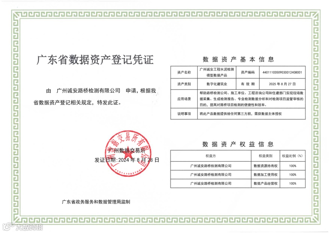 8月28日,道路研究院诚安公司在广州数据交易所完成“广州诚安工程水泥检测模型数据产品”数据资产确权登记,获大湾区首例面向工程试验检测领域《数据资产登记凭证》。诚安公司成为集团首批取得《数据资产登记凭证》的企业。