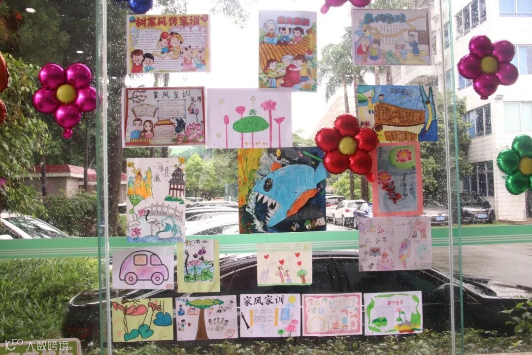 洛溪办公园区2号楼大厅装扮的宛如一个五彩斑斓的童话世界,彩色的气球、可爱的卡通装饰、各种零食礼物让孩子们欢呼不已。其中引人注目的是,玻璃墙上那一幅幅充满童真的好家风绘画作品,孩子们用手中的画笔,描绘出对家、学校和祖国的深深热爱,也抒发了节日的喜悦心情。