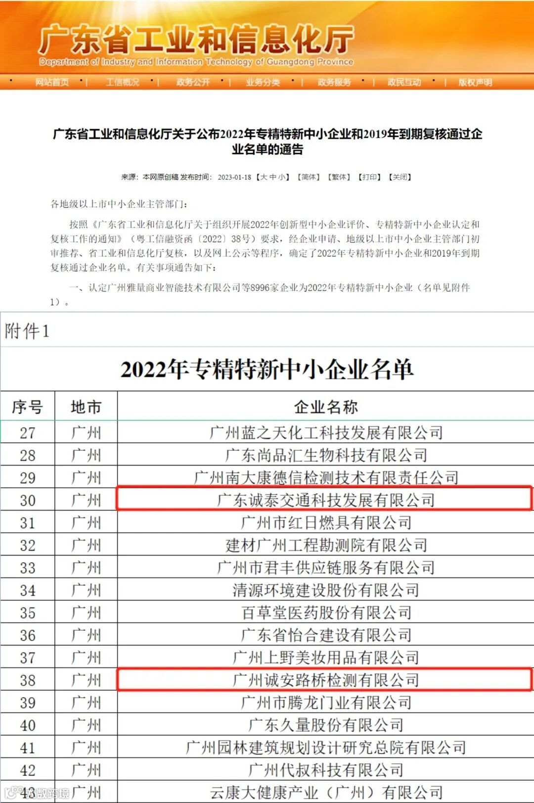 2023年1月18日,广东省工业和信息化厅公布了2022年专精特新中小企业名单。道路研究院下属广东诚泰交通科技发展有限公司(下称“诚泰公司”)、广州诚安路桥检测有限公司(下称“诚安公司”)分别获评广东省2022年“软件与信息服务产业集群”“安全应急与环保产业集群”专精特新中小企业,成为近几年两家公司在技术创新、效益创造等方面高质量发展的又一硬核例证。