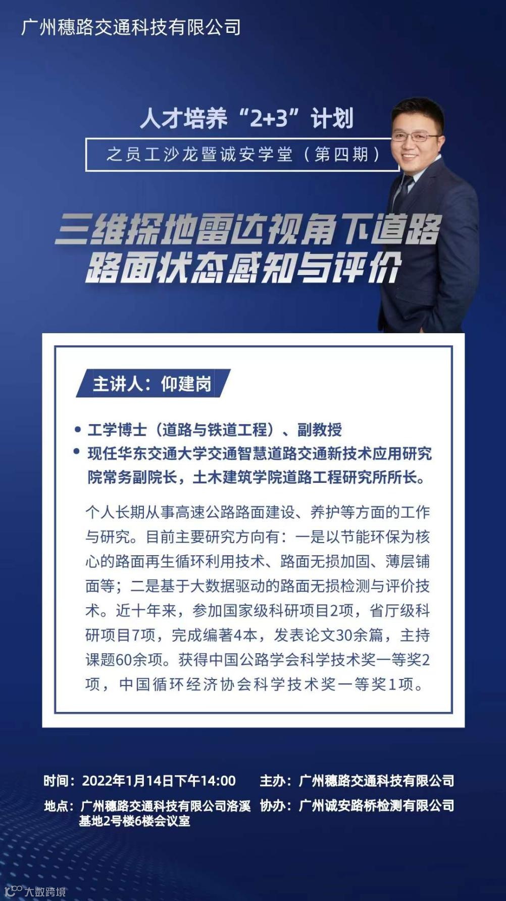 广州市道路研究院有限公司路桥检测之道,需精益求精;保障安畅之路,必孜孜以求。为进一步提升技术人员对工程检测领域新技术的理解与运用,增强检测团队的战斗力,广州穗路交通科技有限公司将于2022年1月14日(星期五)下午14点开展人才培养“2+3”计划之员工沙龙暨诚安学堂(第四期)交流活动。本次活动邀请华东交通大学交通智慧道路交通新技术应用研究院常务副院长、土木建筑学院道路工程研究所所长仰建岗副教授围绕《三维探地雷达视角下道路路面状态感知与评价》专题授课。