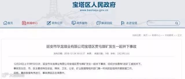 12月24日下午,陕西省延安市宝塔区人民政府官网发布消息,今天上午9时50分许,延安市华龙煤业有限公司宝塔区贯屯煤矿发生一起井下事故,经初步排查有5名矿工被困井下。