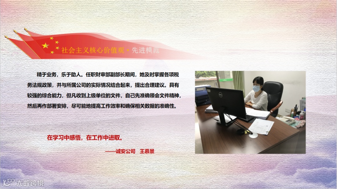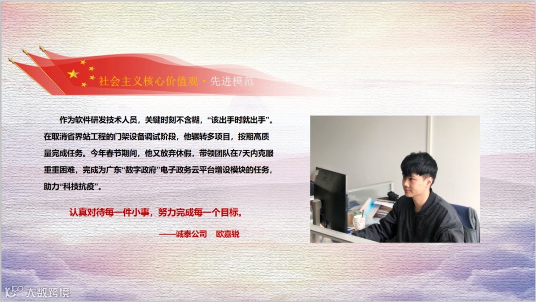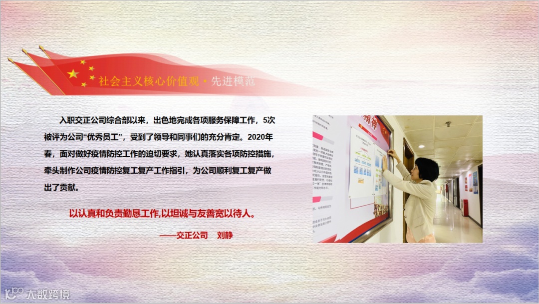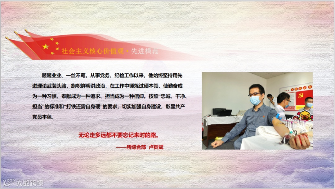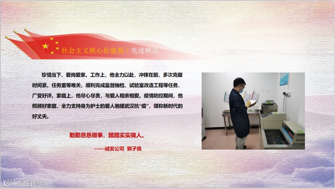 经过员工自荐、公司(部门)筛选、各党支部审核、所纪检组审核、党总支审定、结果公示等环节,王慕景、郭子良、陈建先、李勤勇、钟鸿章等13名充满时代感、饱含正能量的先进个人脱颖而出,成为全所践行社会主义核心价值观的一面面旗帜。
