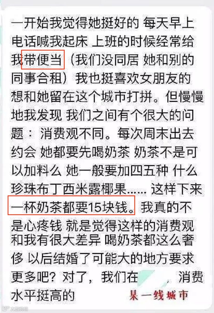 看到矛盾点了吗?男生从细微处发现了两人的消费观出现了很大的差距,其中罪魁祸首居然就是:“那杯可怜的奶茶”。请问奶茶到底得罪了谁?
