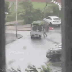 为阻止自家货车侧翻,一个男子冲进狂风中,拼了命撑住货车。
