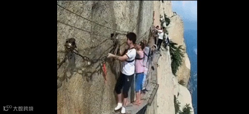 在华山栈道上,一名男性游客,走到栈道中间时,突然解开了自己的安全绳,纵身跳下了山崖。