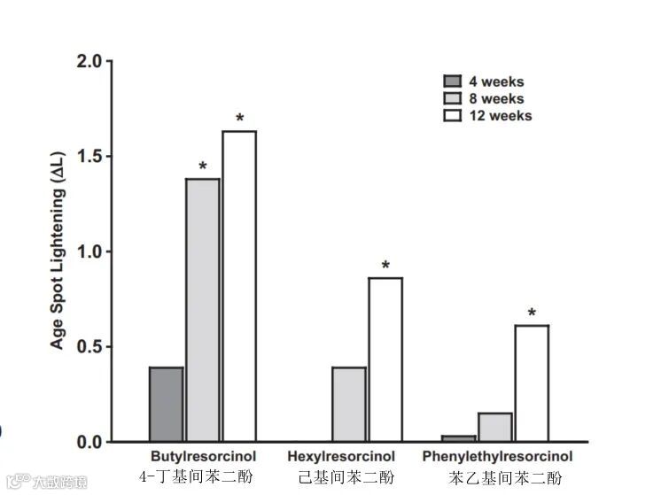 Kolbe等人将氢醌、熊果苷、曲酸和4-丁基间苯二酚的美白性能进行系统性对比研究,测试了4种美白剂对人酪氨酸酶活性的抑制作用,以及在人造皮肤模型MelanoDerm中抑制黑素生成,实验结果显示4-丁基间苯二酚比377还要强6倍多,比曲酸要强24倍,比熊果苷强310倍。 细胞实验与临床应用毕竟还有一定的差距,于是该研究团队还组织了14名老年志愿者(55~60岁,女性)的临床测试。每天使用2次含有0.3%的4-丁基间苯二酚、0.3%己基间苯二酚 和0.5%苯乙基间苯二酚的制剂治疗老年斑。8周后,4-丁基间苯二酚显著减少老年斑,效果明显优于己基间苯二酚和苯乙基间苯二酚。 最后,呈上一例我们实验室内部测试的效果。54岁的老母亲,使用含2%的4-丁基间苯二酚的美白淡斑霜,早晚各一次持续至45天,效果真的太惊艳。肤色每周都在显著的变化,甚至有几处老年斑也逐渐褪掉,只留下淡淡的印记。 还有不少淡化黄褐斑和老年斑的案例,就不一一展示了。4-丁基间苯二酚针对大部分色素性问题都效果很明显。 最后,附加一点小福利,广州地区的朋友,想测试我们美白淡斑霜样品的,欢迎在私信里撩哦。 看到这里,可能有朋友产生疑问了,既然4-丁基间苯二酚比377还要强6倍多,如此吊炸天的美白成分才是地表第二强,那么哪个成分才是地表最强呢?先卖个关子,请继续关注【凡可成分说】的下期内容。 参考文献:彭冠杰,郭清泉,美白化妆品科学与技术,2019 Kolbe L,Mann T,Gerwat W,et al. 4-n-butylresorcinol,a highly effective tyrosinase inhibitor for the topical treatment of hyperpigmentation[J]. Journal of the European Academy of Dermatology and Venereology,2013,27(Suppl 1):19-23. 文章推荐皮肤微生态| 从“谈菌色变”到与菌共舞蘑菇里蕴藏的抗氧化神物【麦角硫因】油痘肌的【大油田】产的是什么油? 皮脂的源泉——皮脂腺变性乙醇,变性后和酒精有什么区别? 揭秘熬夜变老的真相?认识皮肤昼夜生物钟壬二酸——被低估的祛痘控油美白全能成分
