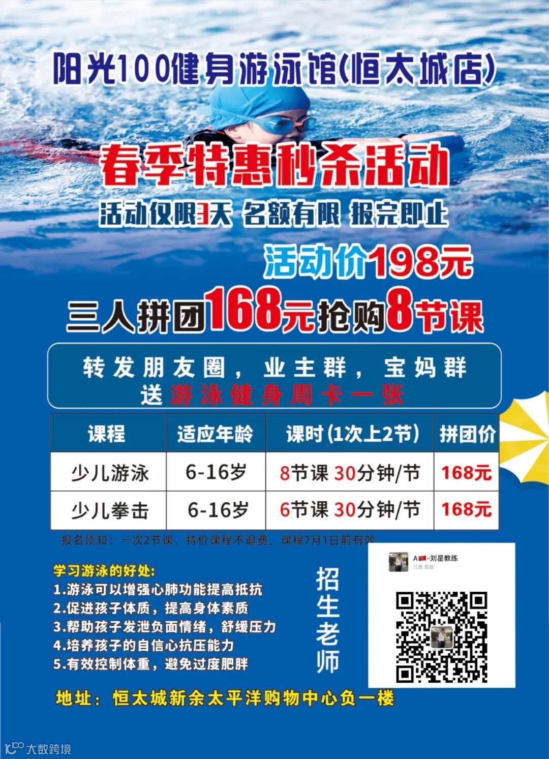 游泳秒杀活动168元抢购8节课!学游泳课,防溺水课程