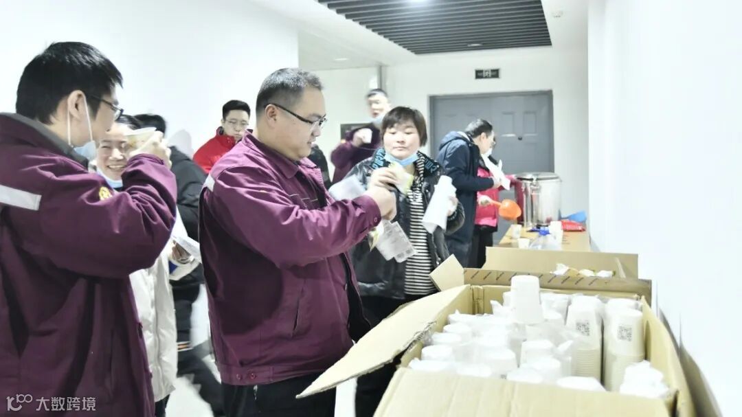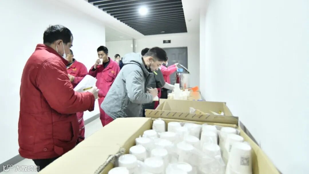 公司准备了红糖水、面包等食物,为大家补充能量。